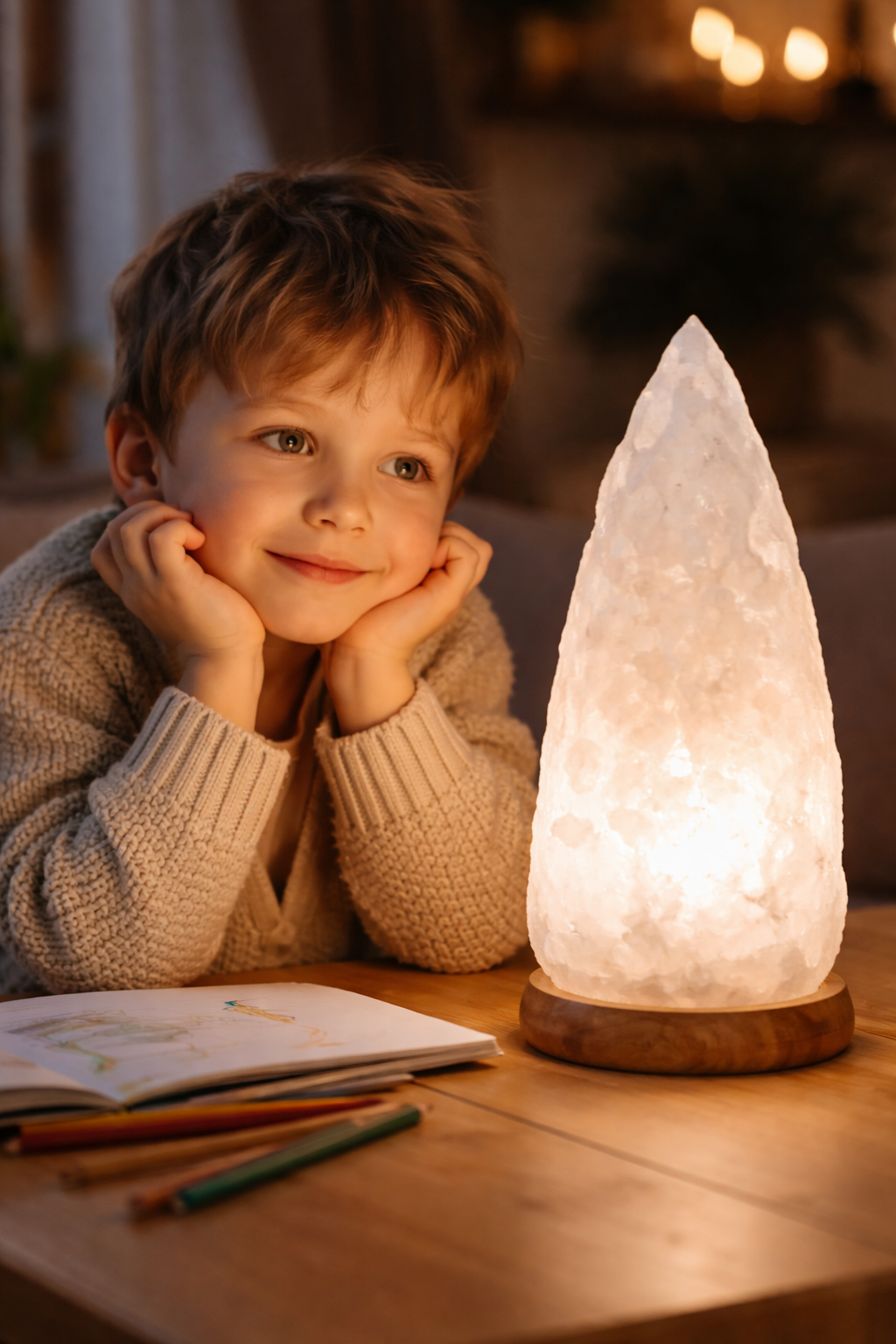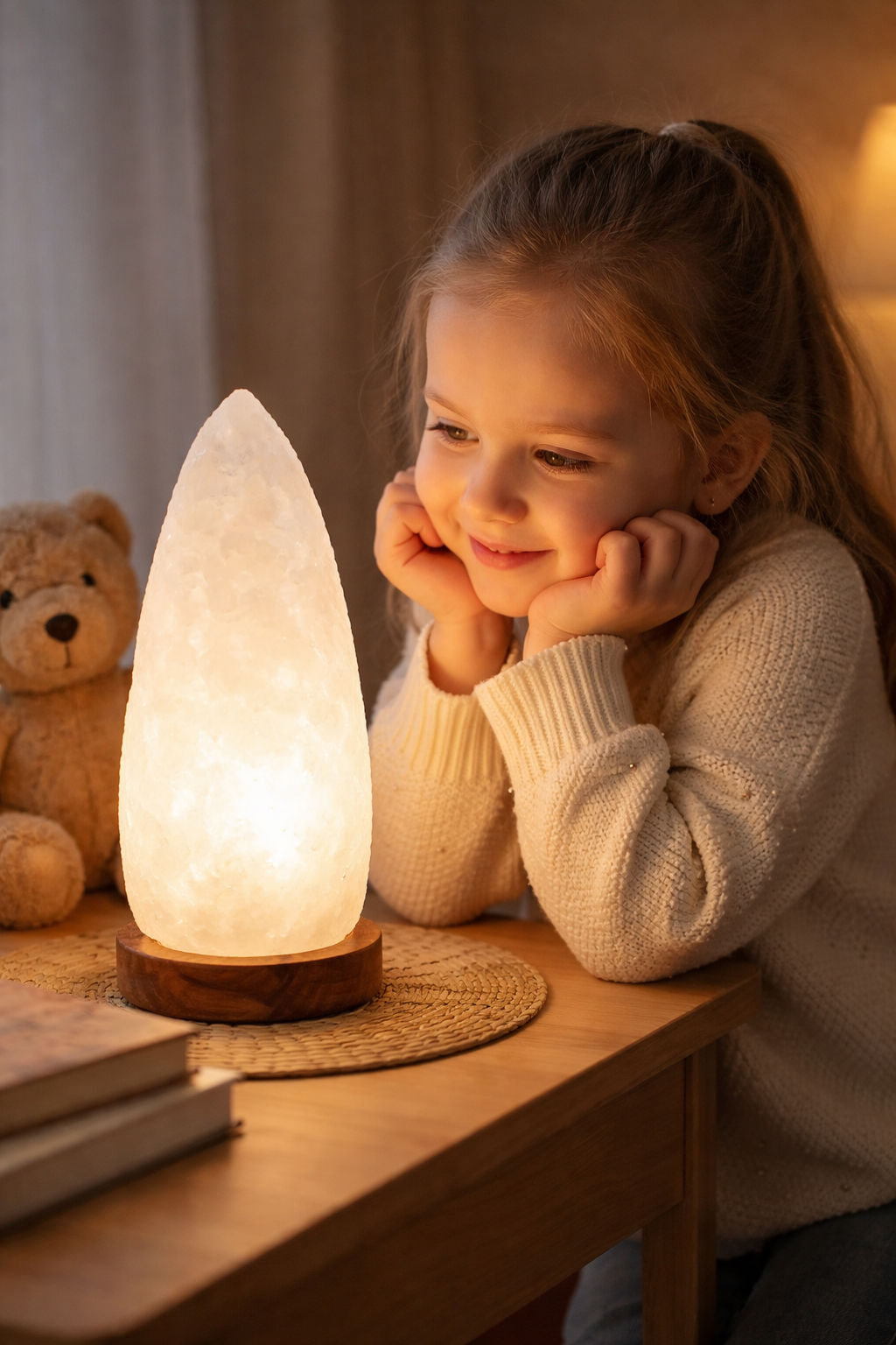 Każda lampka solna dla dziecka emituje miękkie, nierażące światło, dzięki czemu idealnie sprawdza się jako lampka nocna do pokoju dziecka. Naturalna bryła soli sprawia, że każda lampa jest unikalna i estetycznie komponuje się z aranżacją pokoju niemowlęcego, przedszkolnego i szkolnego.